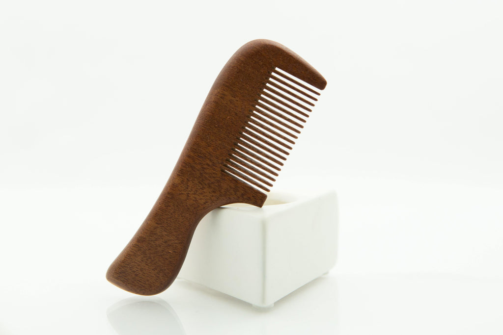 Our handmade, medium tooth, red sandalwood beard & mustache pocket comb is constructed from one piece of wood, this comb is tough and will last for years. Measures approximately 4" long x 1.5" wide This comb is designed to evenly disperse natural oils and prevent tangles and split ends, leaving your facial hair looking perfectly groomed. No more dreaded knots.